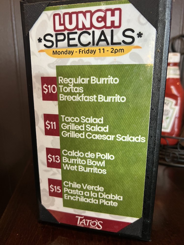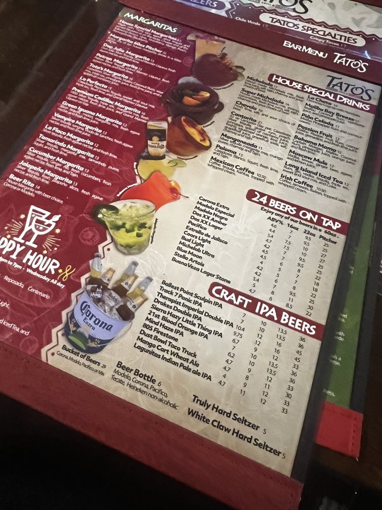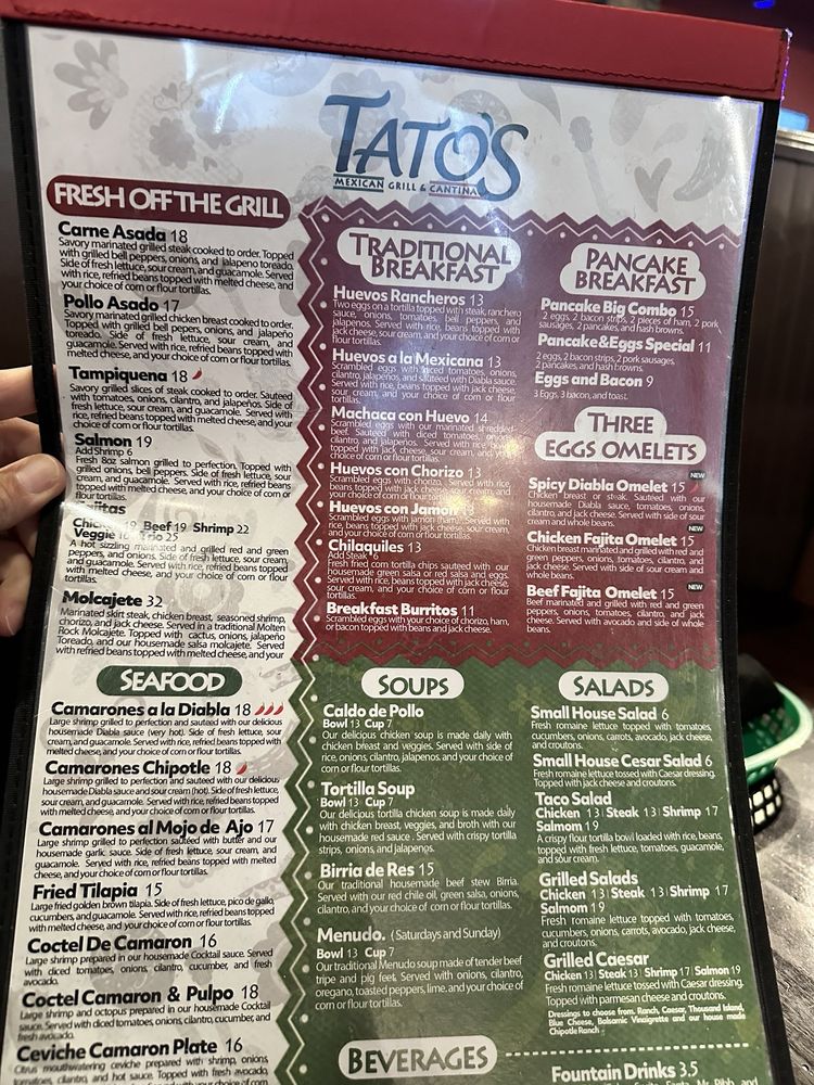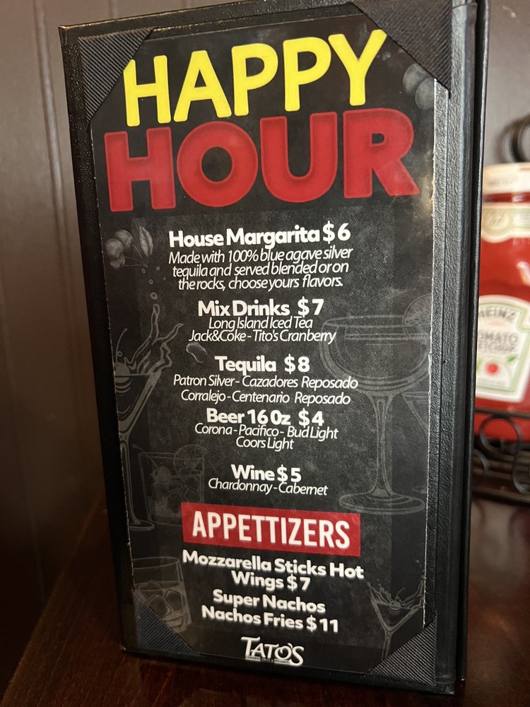 Introducing Tato’s Mexican Grill & Cantina, a vibrant eatery located in Manteca, CA. Offering a plethora of traditional Mexican dishes, Tato’s is a go-to spot for breakfast, lunch, and dinner. The menu features classic options like Huevos Rancheros, Chilaquiles, and a variety of lunch specials including Tacos, Enchiladas, and Quesadillas. Don't miss out on their appetizers like the flavorful Guacamole Dip or the zesty Ceviche Camaron Plate. The restaurant provides a range of amenities including outdoor seating, wheelchair accessibility, and free Wi-Fi. With a full bar, happy hour specials, and a dog-friendly atmosphere, Tato’s Mexican Grill & Cantina is not just a place to eat, but a destination for a truly immersive Mexican dining experience.