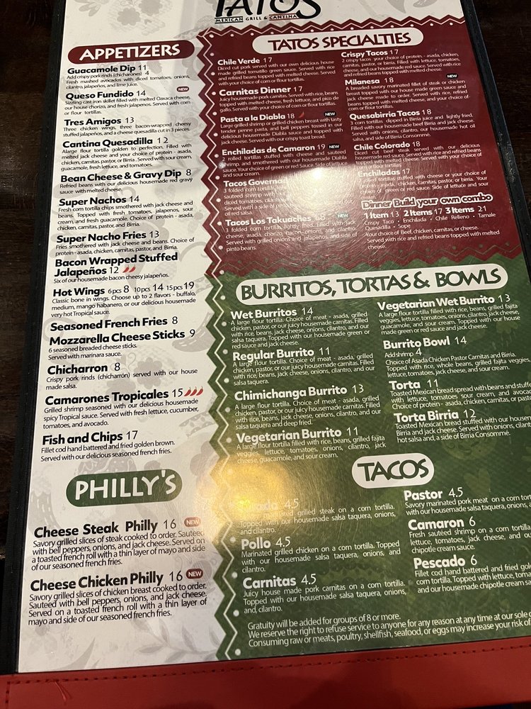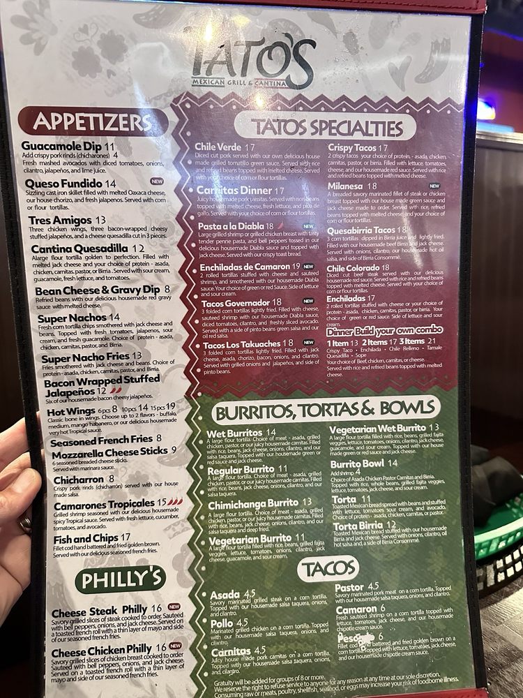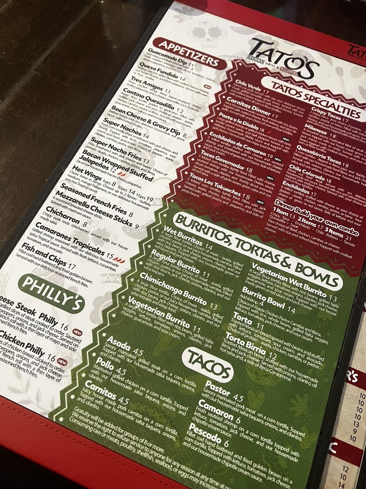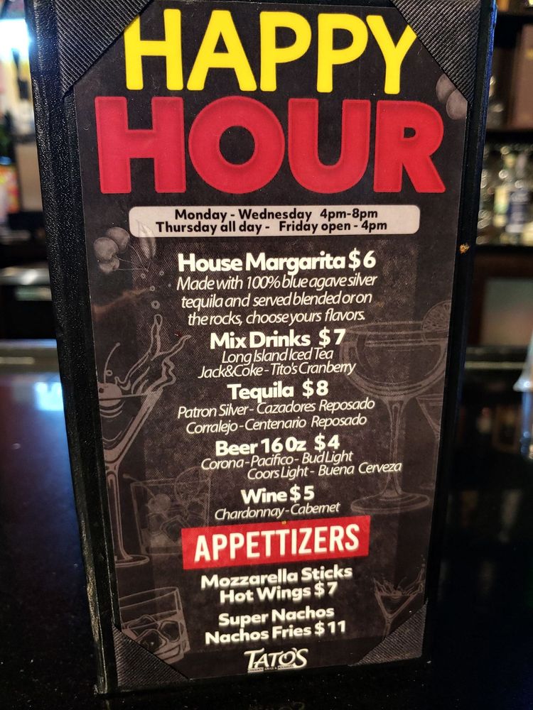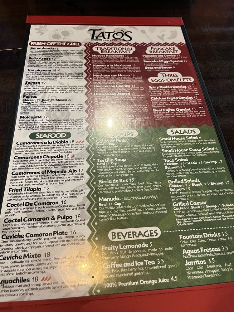Introducing Tato’s Mexican Grill & Cantina, a vibrant eatery located in Manteca, CA. Offering a plethora of traditional Mexican dishes, Tato’s is a go-to spot for breakfast, lunch, and dinner. The menu features classic options like Huevos Rancheros, Chilaquiles, and a variety of lunch specials including Tacos, Enchiladas, and Quesadillas. Don't miss out on their appetizers like the flavorful Guacamole Dip or the zesty Ceviche Camaron Plate. The restaurant provides a range of amenities including outdoor seating, wheelchair accessibility, and free Wi-Fi. With a full bar, happy hour specials, and a dog-friendly atmosphere, Tato’s Mexican Grill & Cantina is not just a place to eat, but a destination for a truly immersive Mexican dining experience.